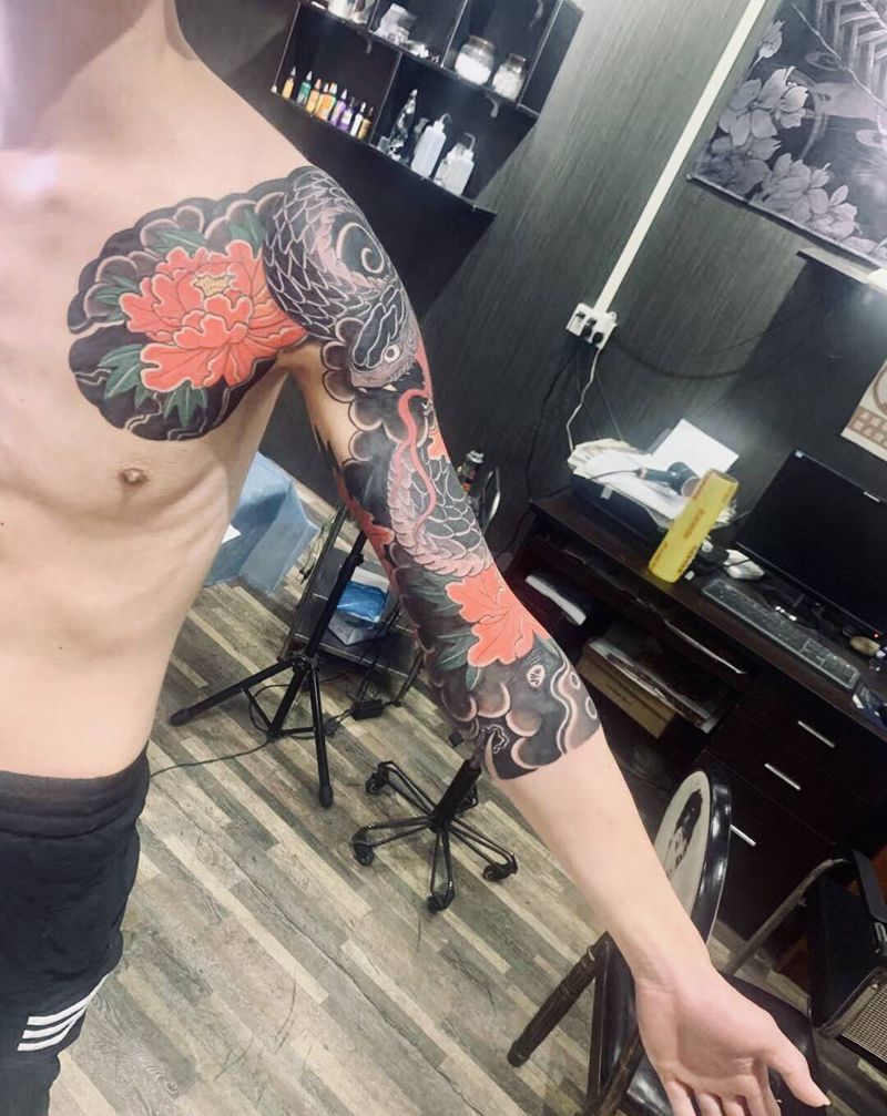 当前位置: 首页 >广西柳州市纹身店-念刺青工作室纹身图案>蛇戏牡丹七分袖纹身图片_手臂老传统纹身图案