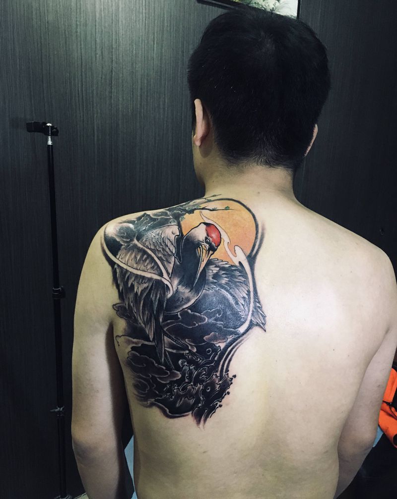 仙鹤遮盖懒洋洋纹身图片_背部新传统纹身图案
