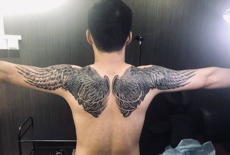 当前位置: 首页 >广西柳州市纹身店-念刺青工作室纹身图案>守护之翼纹身图片_背部手臂翅膀纹身图案