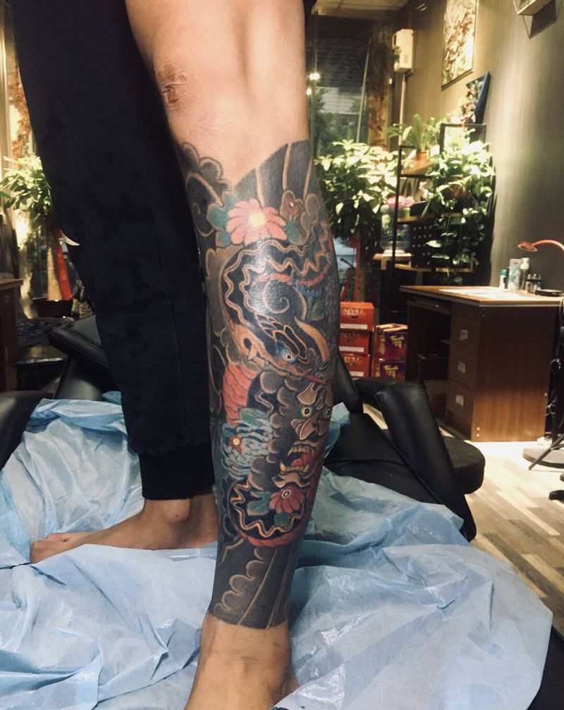 • T网红王老大花腿龙纹身图片_腿部新传统纹身图案