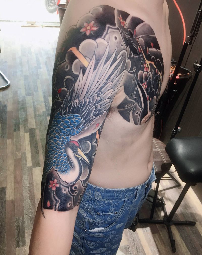 当前位置: 首页 >广西柳州市纹身店-念刺青工作室纹身图案>半甲遮盖修改纹身图片_手臂胸部纹身图案