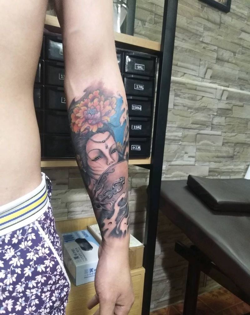 当前位置: 首页 >广西柳州市纹身店-念刺青工作室纹身图案>艺妓牡丹包小臂纹身图片