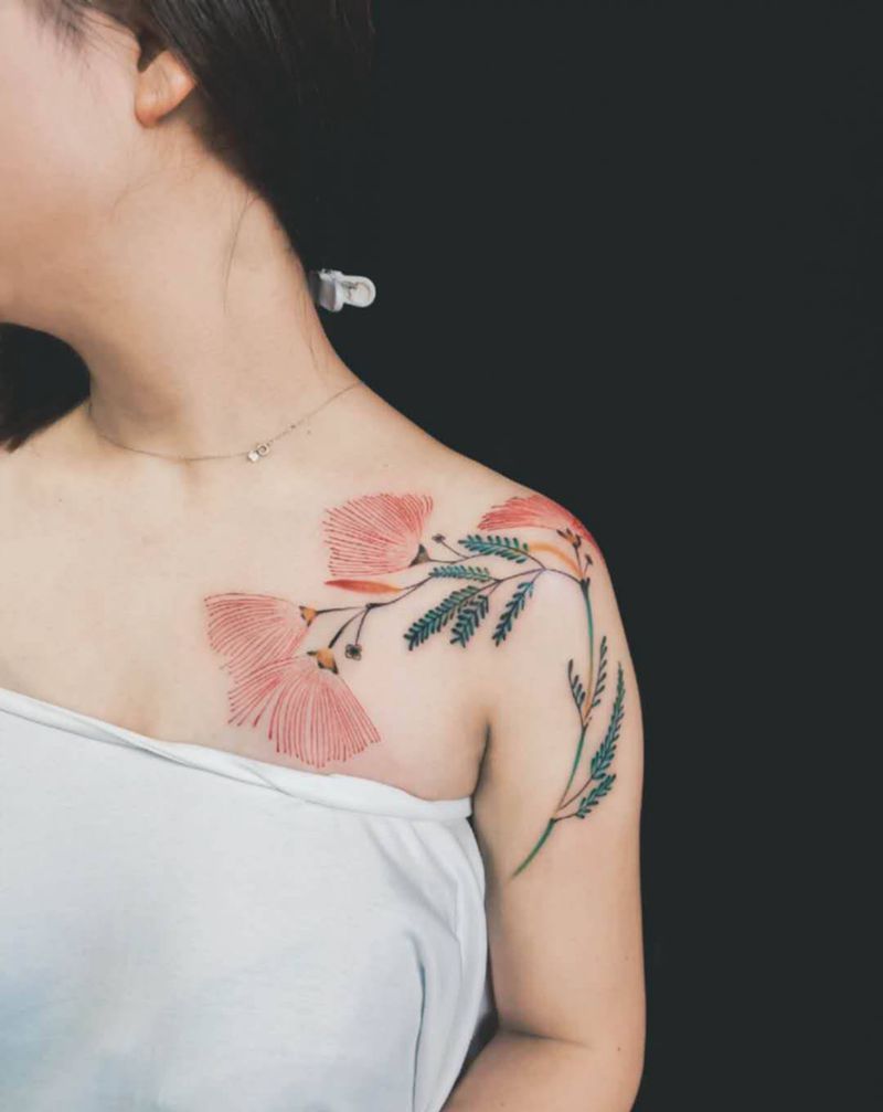 当前位置: 首页 >广西柳州市纹身店-念刺青工作室纹身图案>合欢花纹身图片_肩部新传统纹身图案