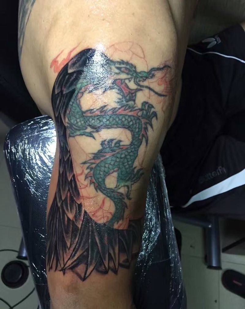 • T网红王老大花腿龙纹身图片_腿部新传统纹身图案