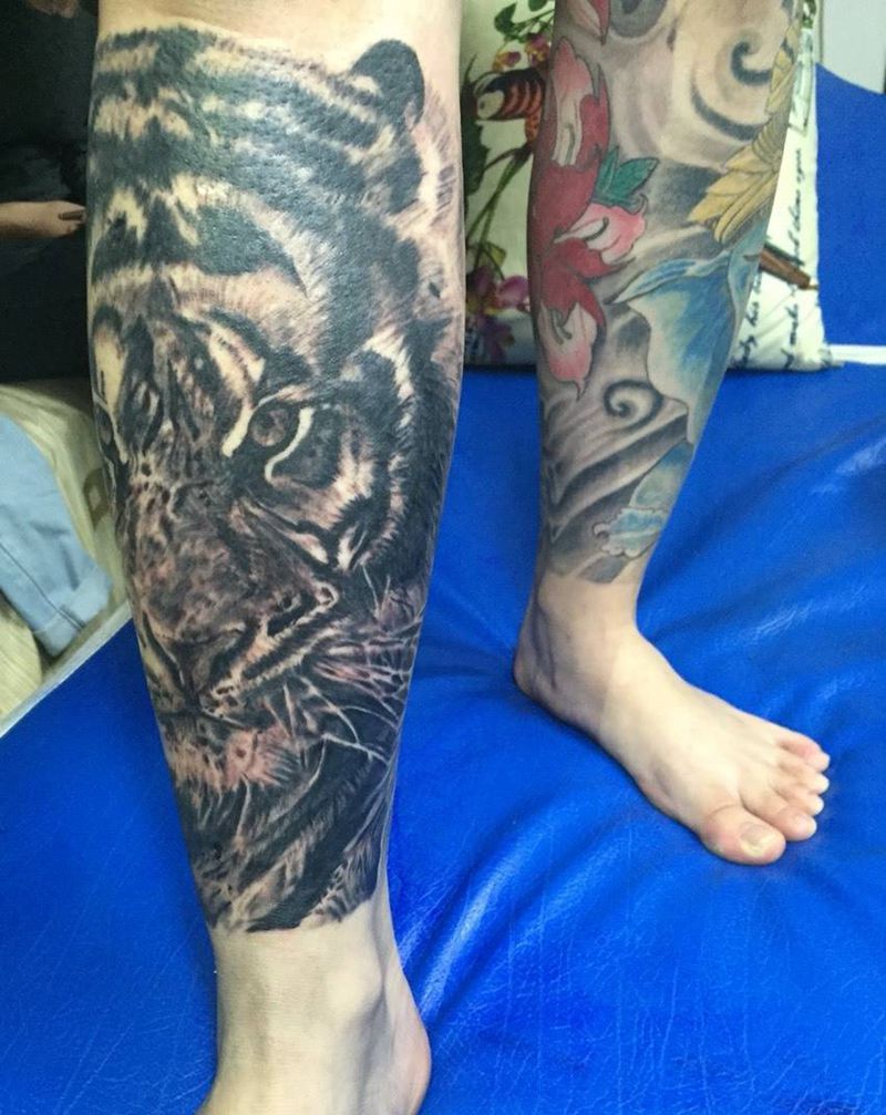当前位置: 首页 >广西南宁市纹身店-轩铭刺青纹身工作室纹身图案>通宵完成写实老虎纹身图片_成品腿部写实动物纹身图案