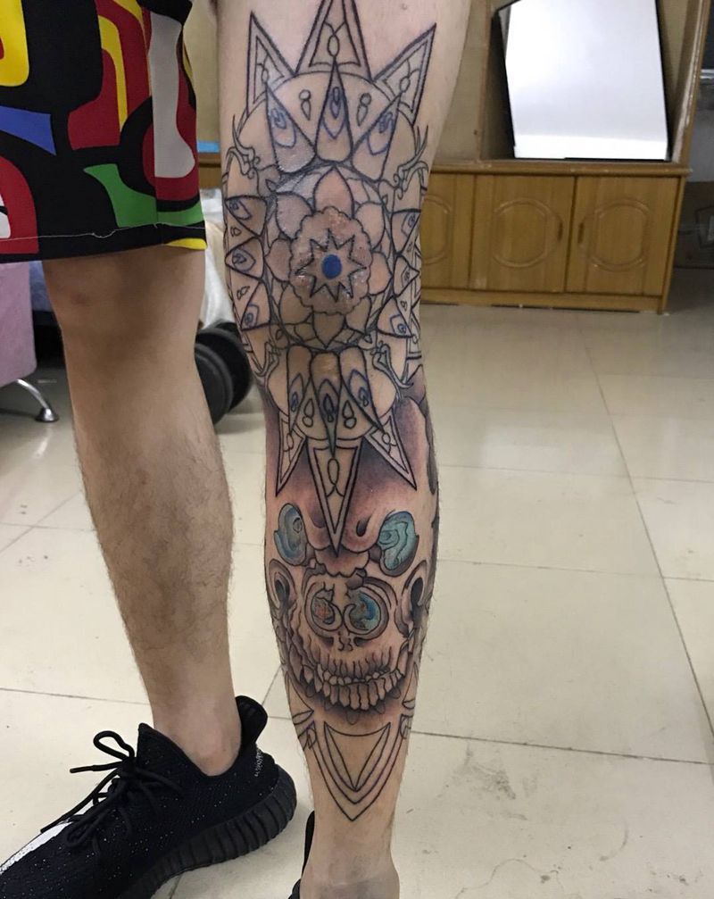 • T网红王老大花腿龙纹身图片_腿部新传统纹身图案