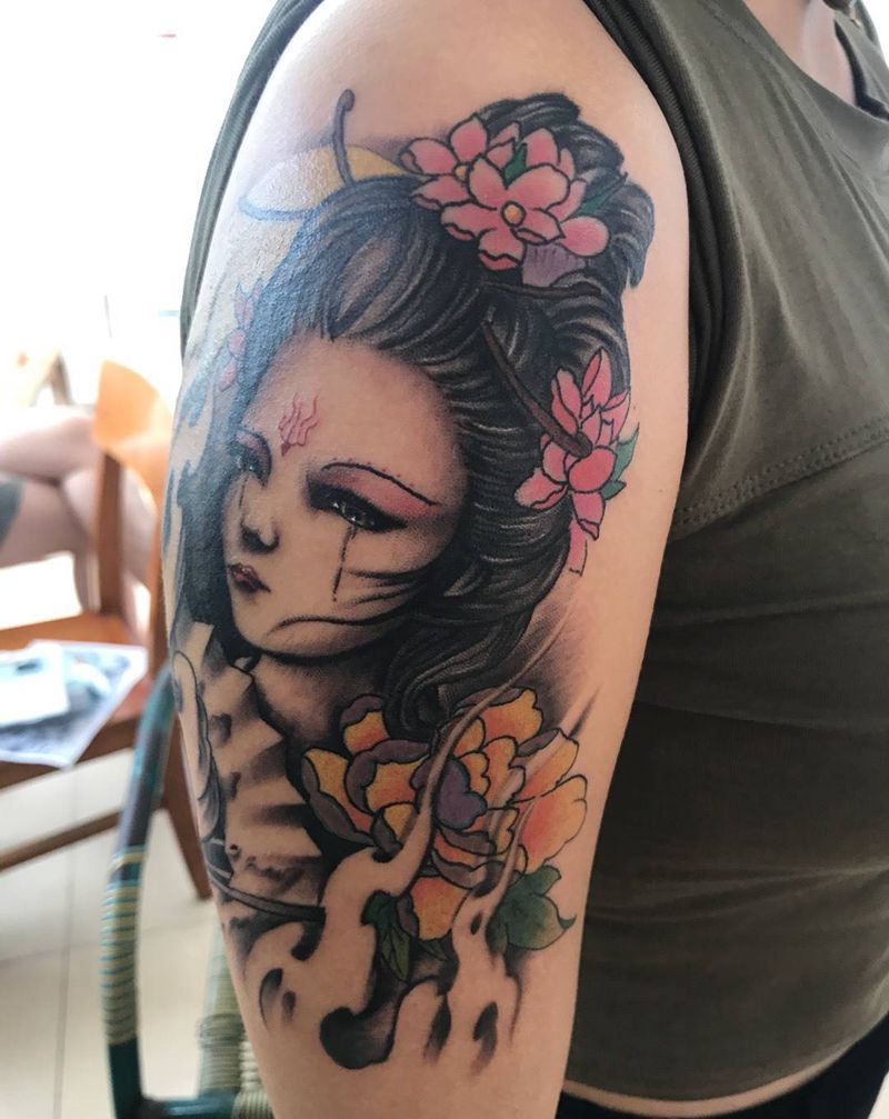 当前位置: 首页 >广西南宁市纹身店-轩铭刺青纹身工作室纹身图案>美女艺妓完成纹身图片_成品手部手臂传统人物纹身图案