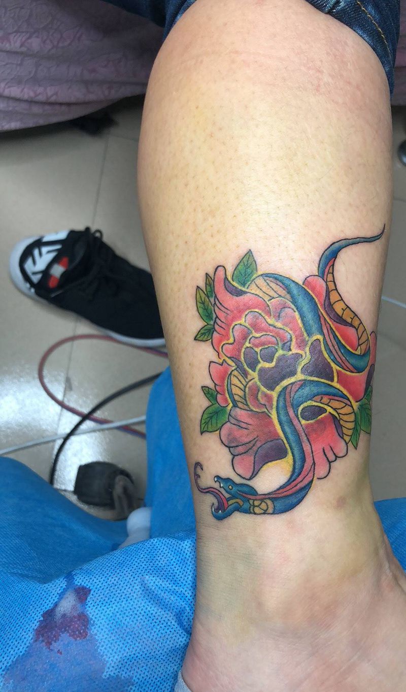 • T网红王老大花腿龙纹身图片_腿部新传统纹身图案