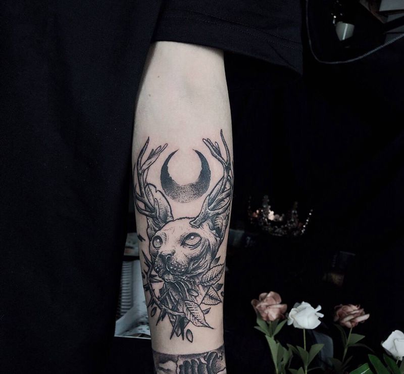 点刺芬克斯猫纹身图片_手臂点刺纹身图案