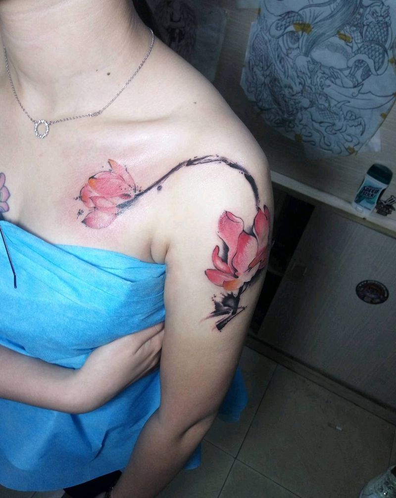 水墨荷花纹身图片_肩部纹身图案