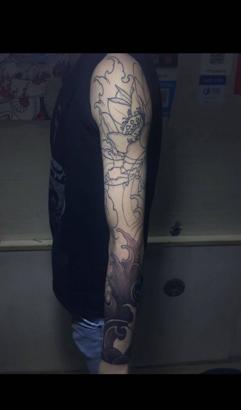 当前位置: 首页 >广西南宁市纹身店-晓龙刺青专业纹身纹身图案>花臂水浪荷花纹身图片_手臂传统纹身图案