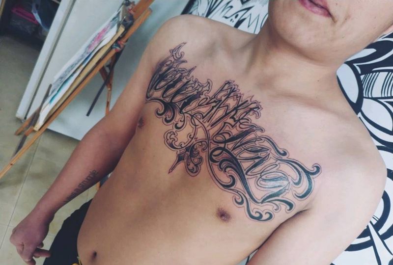 花体英文纹身图片_胸部纹身图案