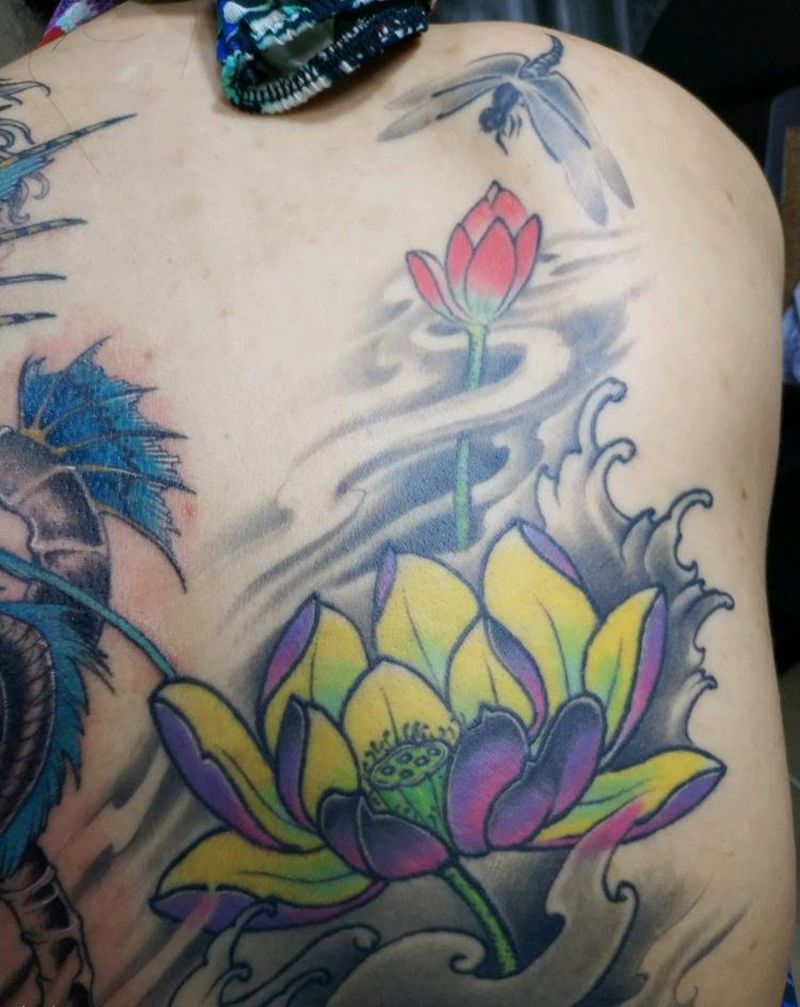 传统荷花拼接美人鱼纹身图片_背部新传统Old School荷花纹身图案