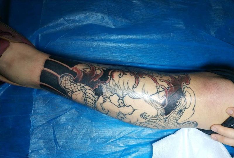 • T网红王老大花腿龙纹身图片_腿部新传统纹身图案