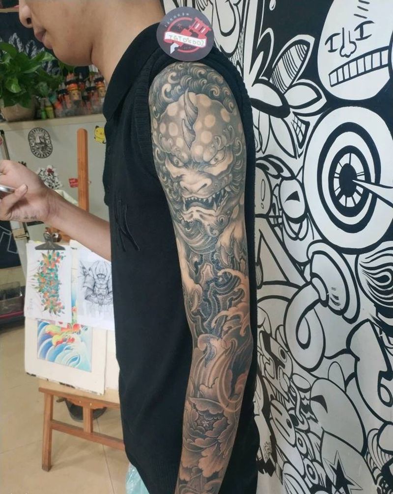 当前位置: 首页 >广西南宁市纹身店-晓龙刺青专业纹身纹身图案>唐狮花臂水浪纹身图片_手臂老传统新传统纹身图案