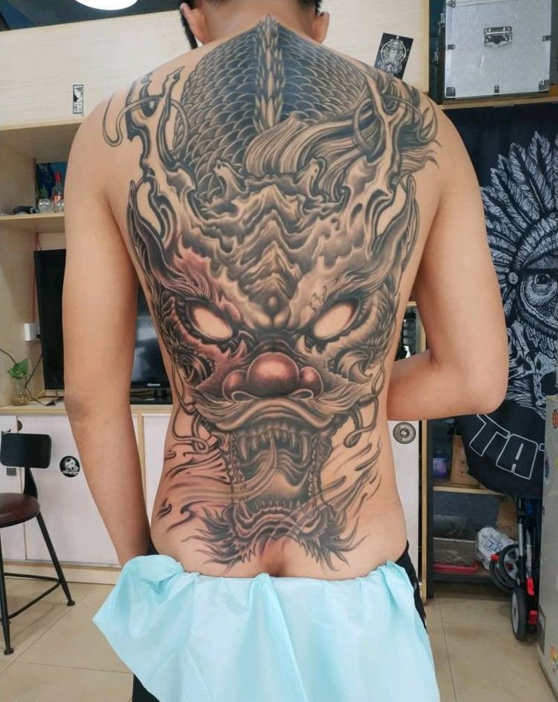 满背龙头纹身图片_背部新传统纹身图案