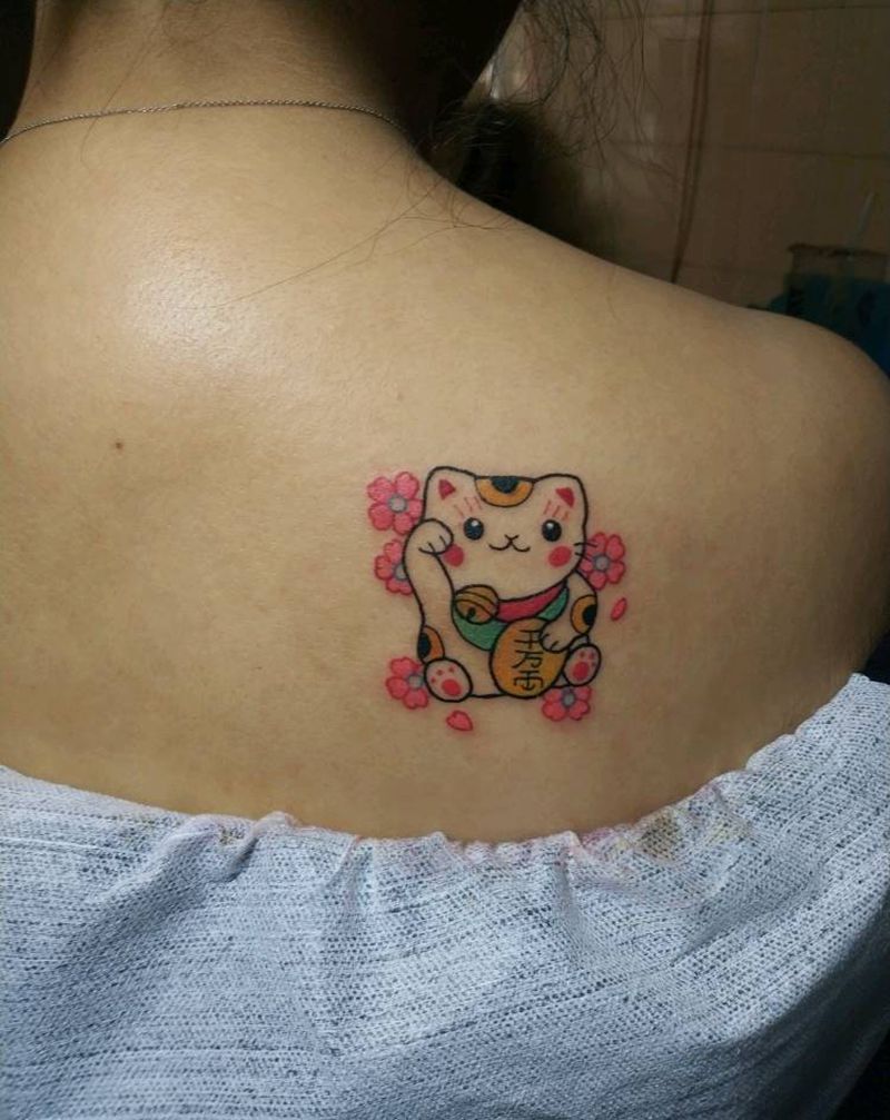 招财猫纹身图片_肩部纹身图案
