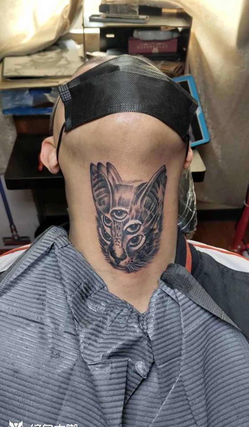 当前位置: 首页 >广西柳州市纹身店-潮拜刺青工作室纹身图案>脖子猫和经典玫瑰纹身图片_颈部欧美写实Old School猫玫瑰