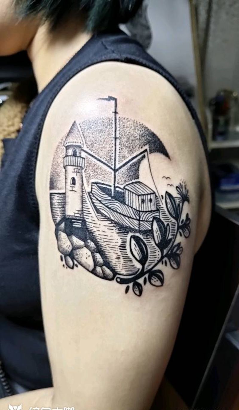 当前位置: 首页 >广西柳州市纹身店-潮拜刺青工作室纹身图案>梦想之灯塔纹身图片_手臂Old School图腾纹身图案