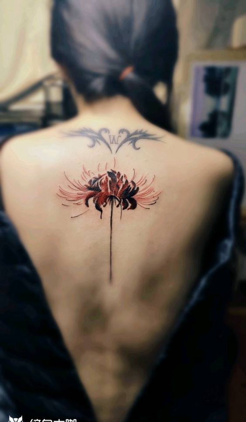 彼岸花纹身图片_背部水彩新传统彼岸花纹身图案