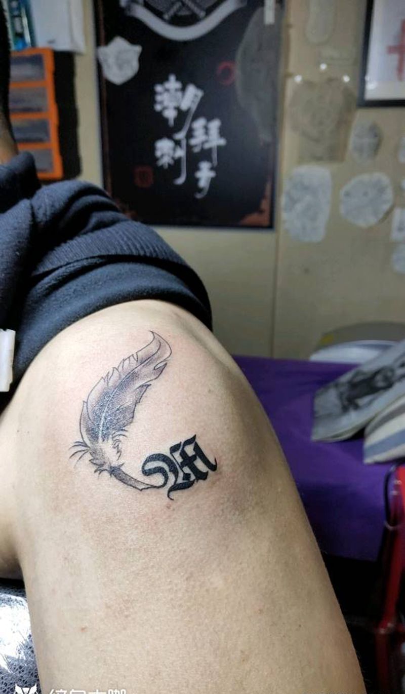 情侣纹身原创设计纹身图片_手臂几何花体字羽毛文字纹身图案