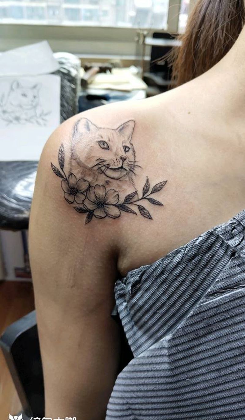 可爱的猫和素花纹身图片_肩部胸部欧美写实水墨猫素花纹身图案