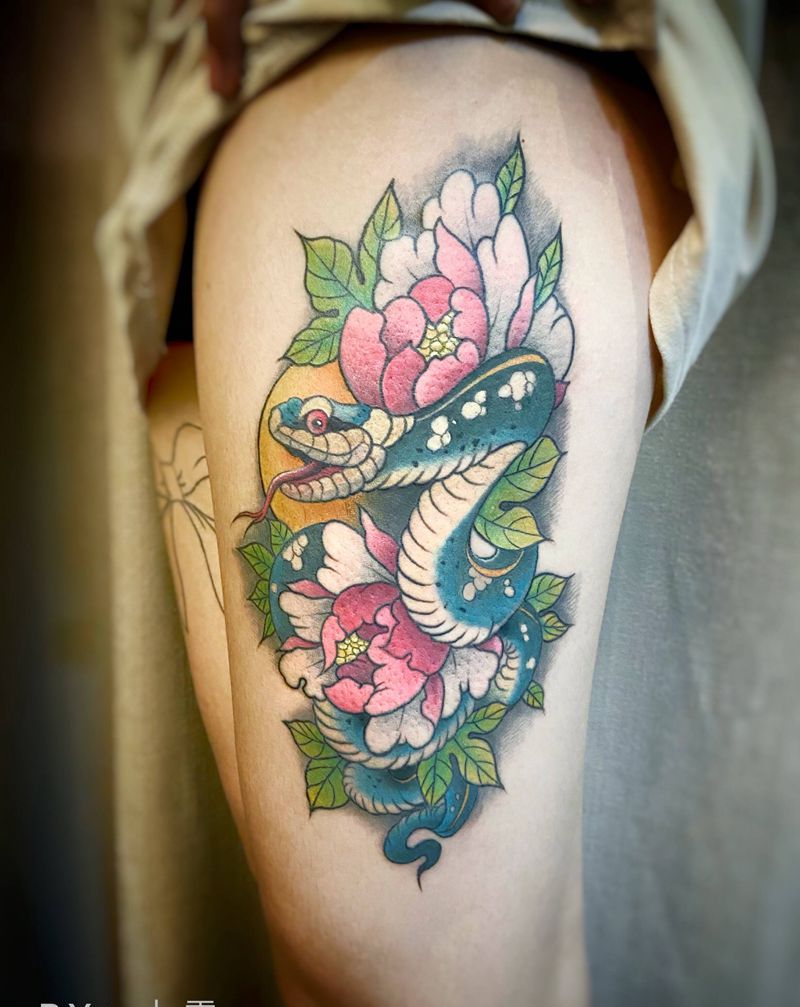 • T网红王老大花腿龙纹身图片_腿部新传统纹身图案