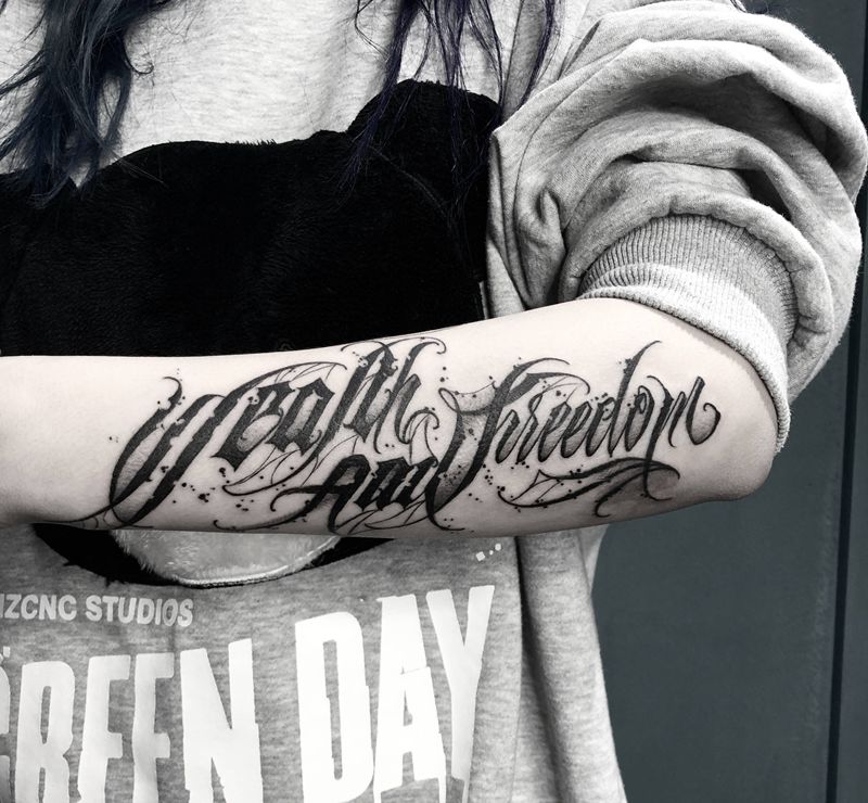当前位置: 首页 >广西柳州市纹身店-川木刺青社纹身图案>Wealth and Free纹身图片_花体字纹身图案