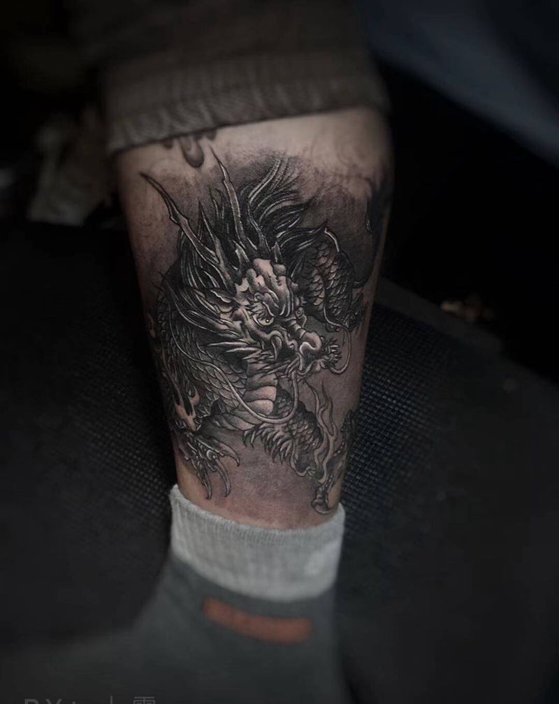 • T网红王老大花腿龙纹身图片_腿部新传统纹身图案