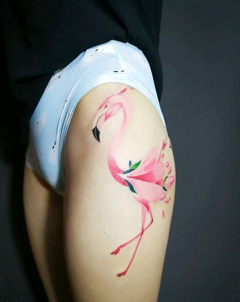 火烈鸟纹身图片_臀部腿部水彩火烈鸟纹身图案