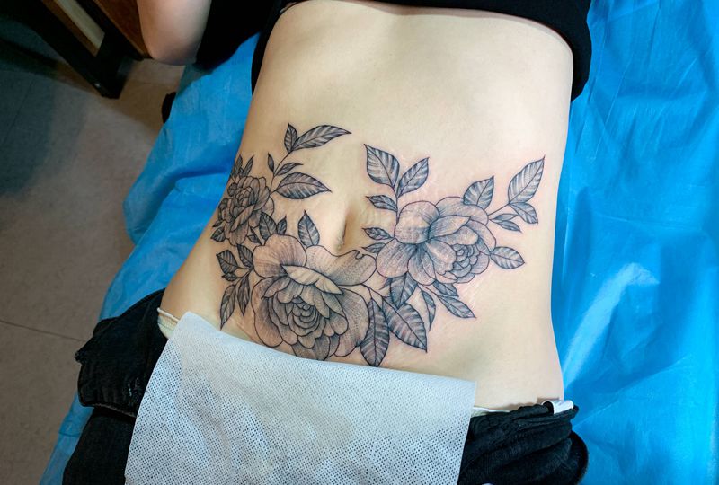 素花覆盖纹身图片_腹部新传统点刺纹身图案