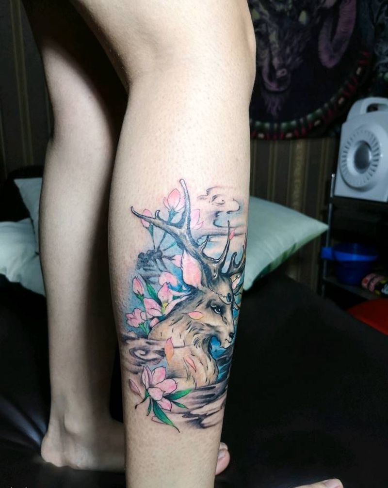 当前位置: 首页 >广西柳州市纹身店-东尚纹身纹身图案>鹿纹身图片_腿部老传统水彩鹿纹身图案