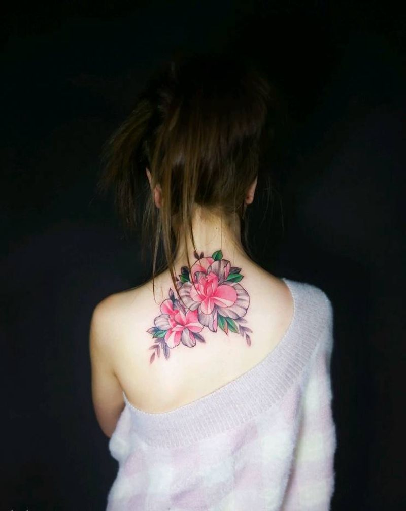 素花纹身图片_肩部背部新传统水彩纹身图案