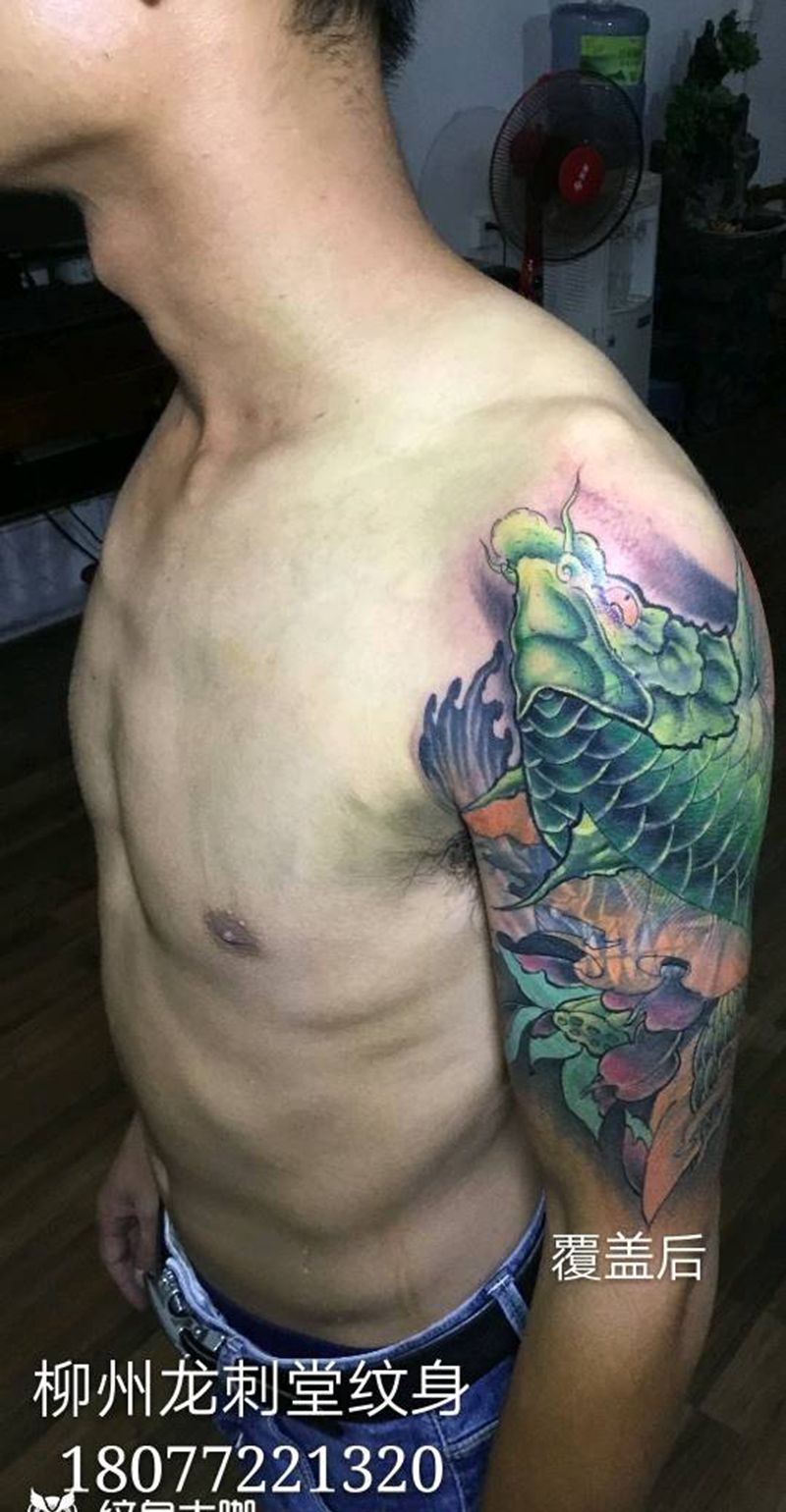当前位置: 首页 >广西柳州市纹身店-龙刺堂纹身工作室(谷埠店)纹身图案>覆盖旧纹身纹身图片_手臂新传统鱼纹身图案