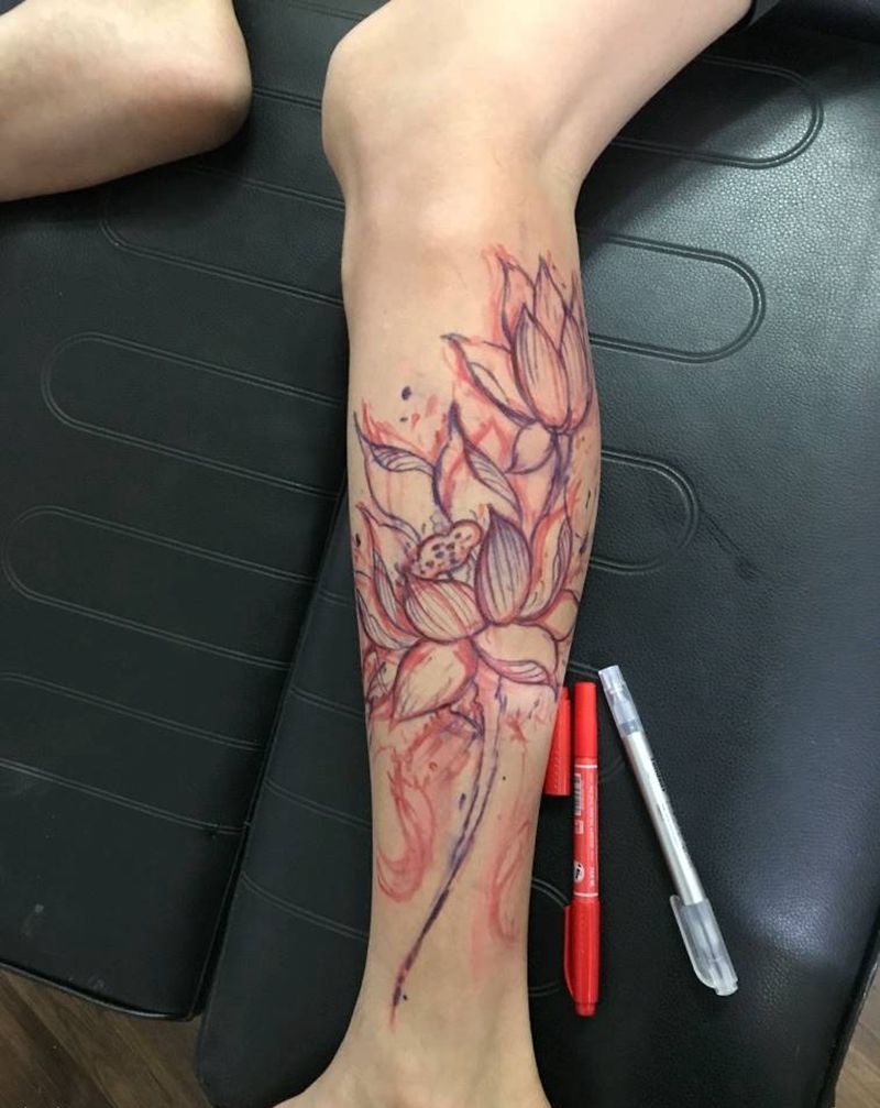 荷花纹身图片_腿部水彩水墨植物纹身图案