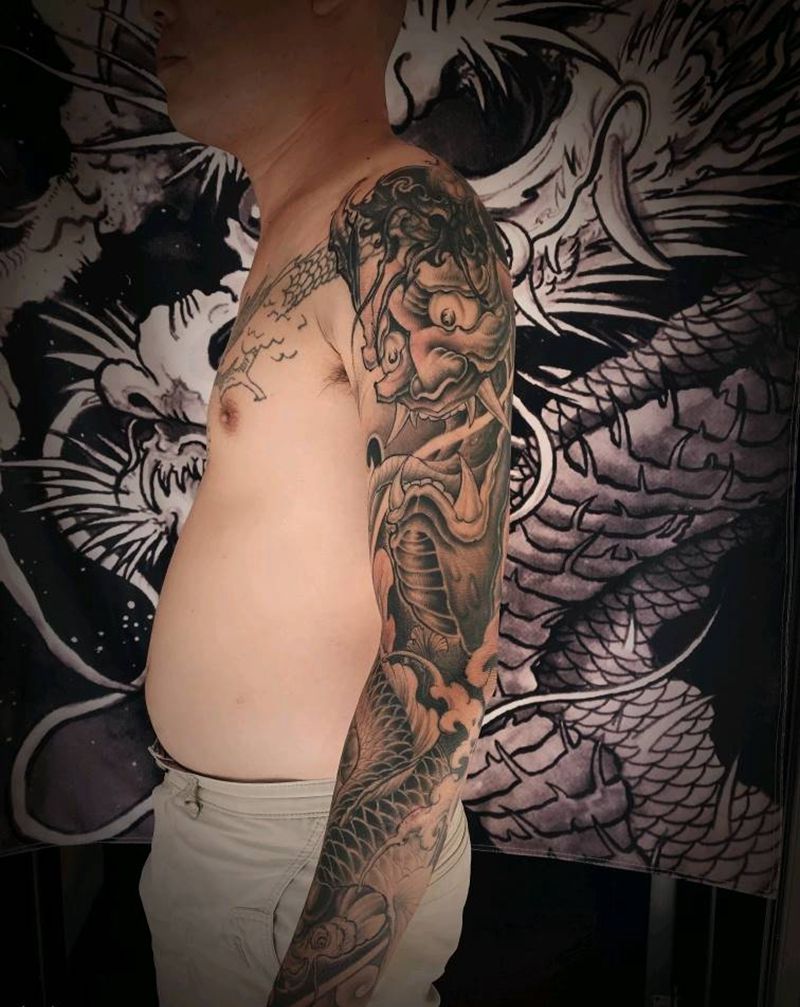 当前位置: 首页 >广西柳州市纹身店-龙刺堂纹身工作室(谷埠店)纹身图案>花臂覆盖旧纹身纹身图片_手臂新传统般若鱼纹身图案