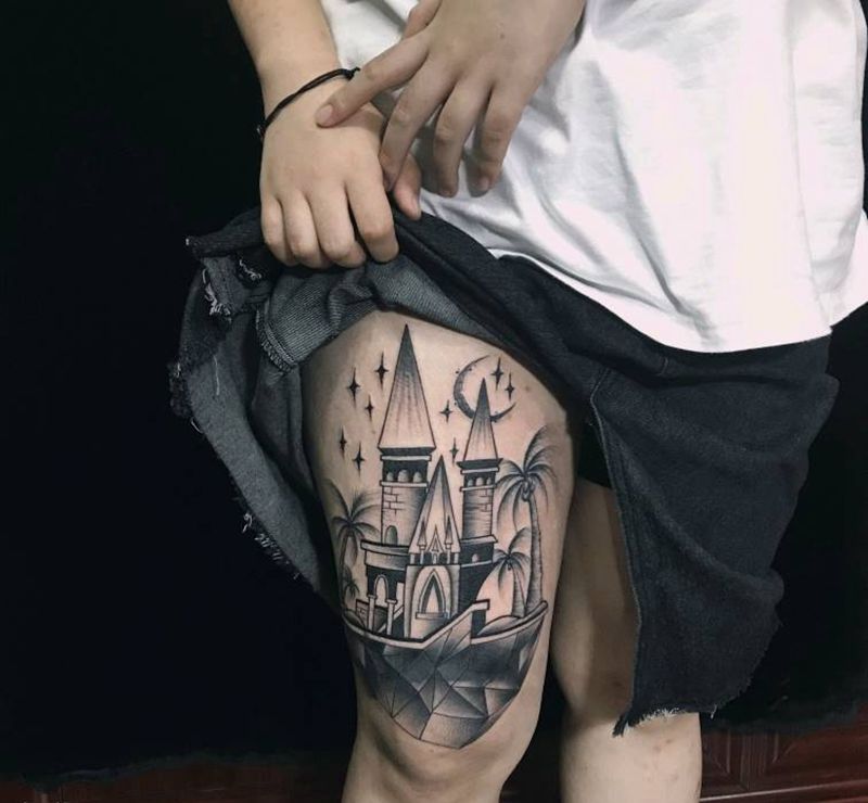 当前位置: 首页 >广西柳州市纹身店-龙刺堂纹身工作室(谷埠店)纹身图案>建筑覆盖旧文身纹身图片_腿部新传统建筑覆盖纹身图案