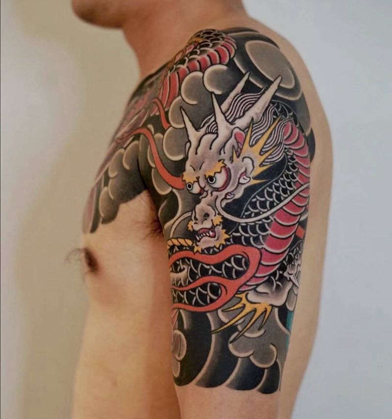 老传统龙云半甲纹身图片_肩部胸部老传统龙,云纹身图案