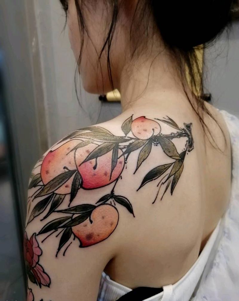 桃子纹身图片_肩部背部水墨水彩纹身图案
