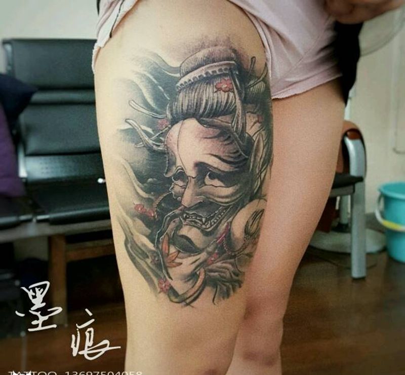 般若艺妓纹身图片_腿部传统人物鬼神成品纹身图案