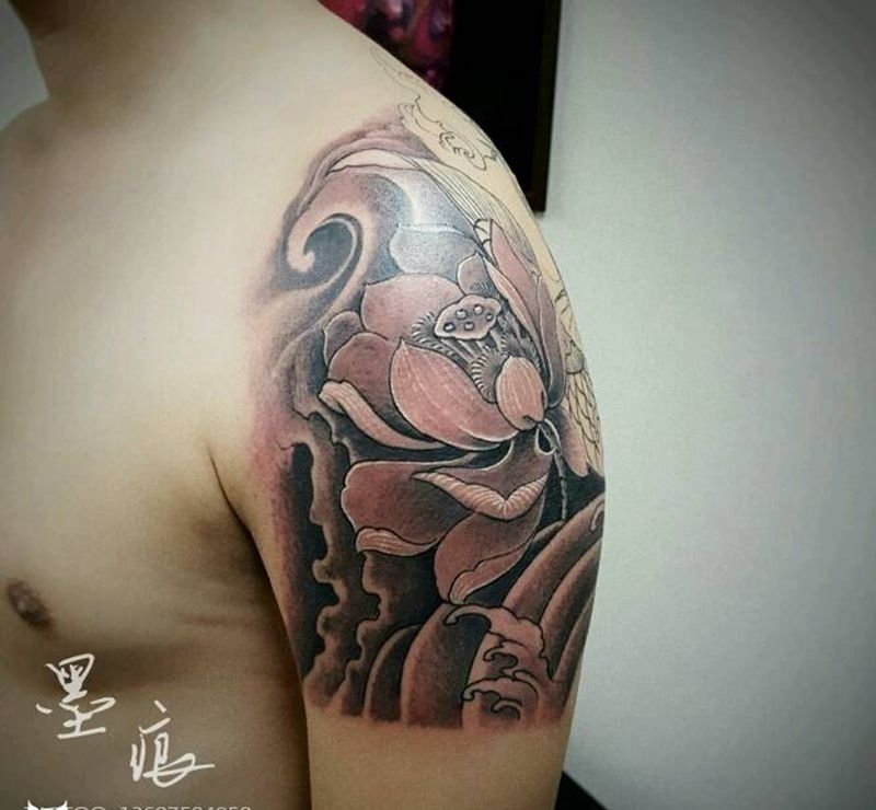 今日工事、鱼、荷纹身图片_肩部手臂传统动物植物成品纹身图案