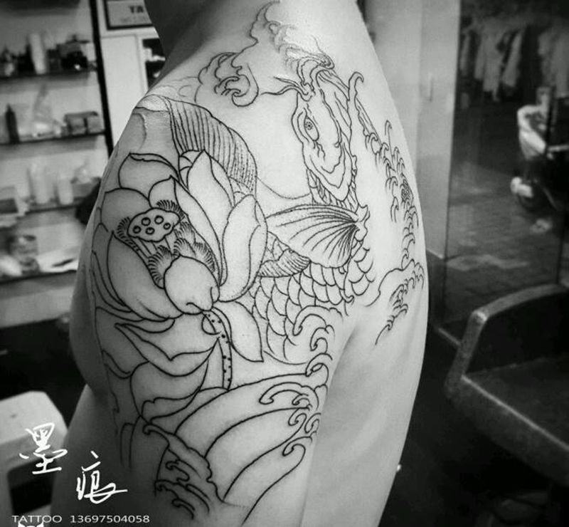 当前位置: 首页 >海南省海口市纹身店-海口.墨痕刺青纹身图案>今日工事、鱼、荷纹身图片_肩部手臂传统动物植物成品纹身图案