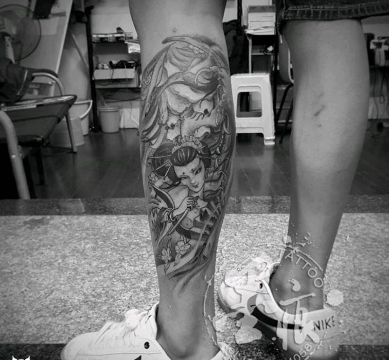 • T包小腿吹火男+阿多福纹身图片_腿部老传统新传统吹火男阿