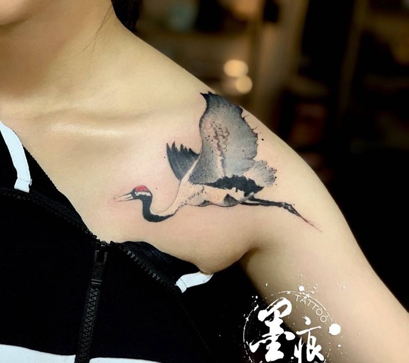 鹤纹身图片_肩部水墨纹身图案