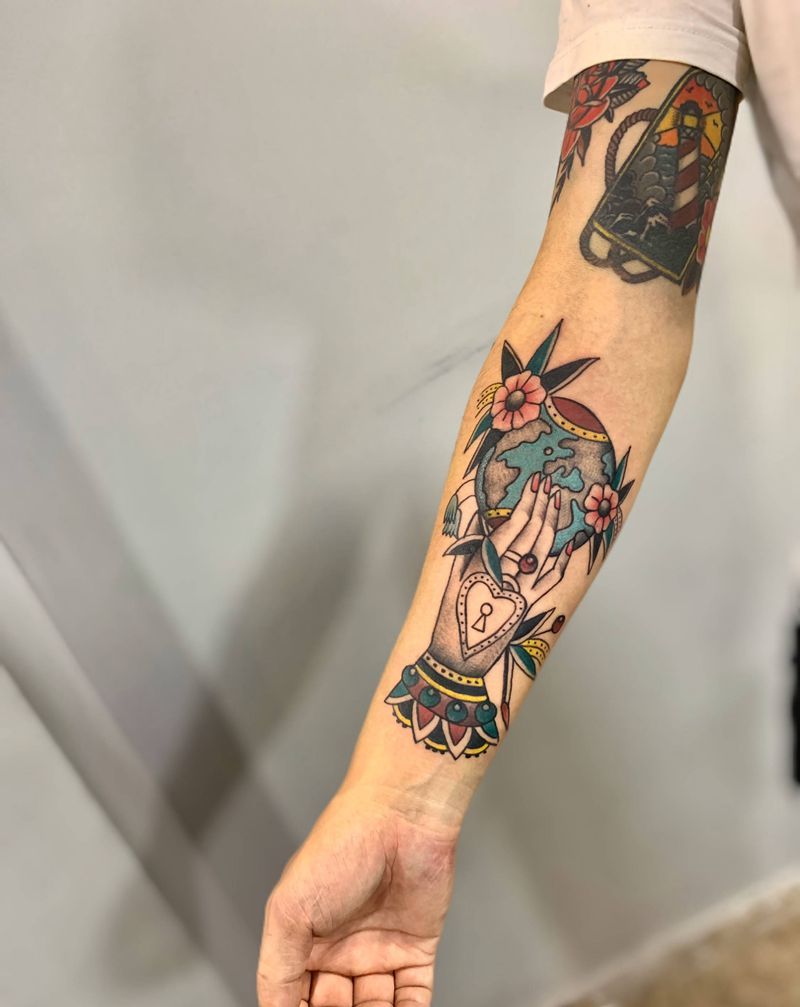 【美好世界尽在手中】纹身图片_手部手臂Old School纹身图案