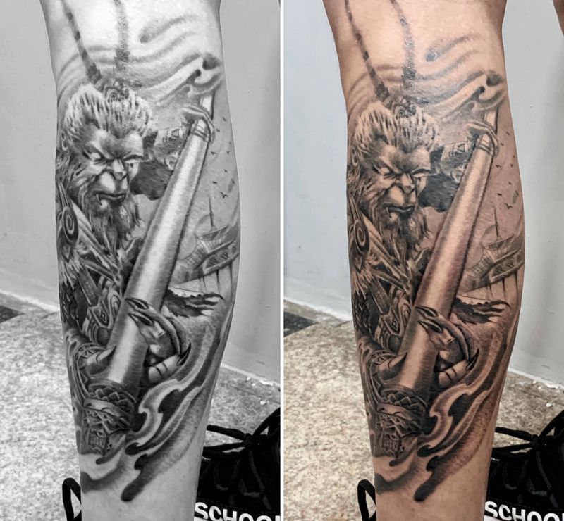 当前位置: 首页 >海南省海口市纹身店-海口.墨痕刺青纹身图案>【猴】纹身图片_脚部腿部新传统纹身图案