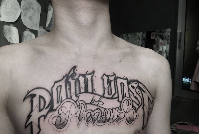 当前位置: 首页 >广西贵港市纹身店-罐头刺青纹身图案>客人自带纹身图片_胸部花体字纹身图案