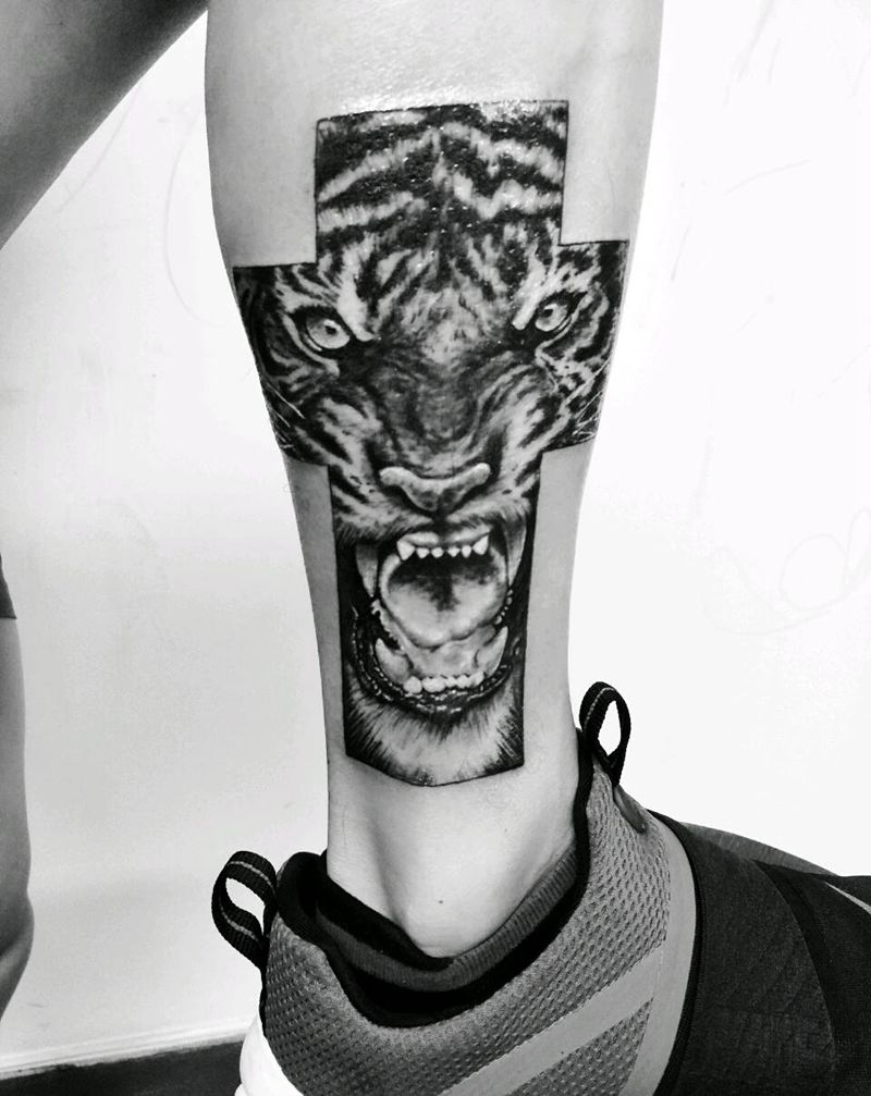 虎纹身纹身图片_腿部写实动物成品纹身图案