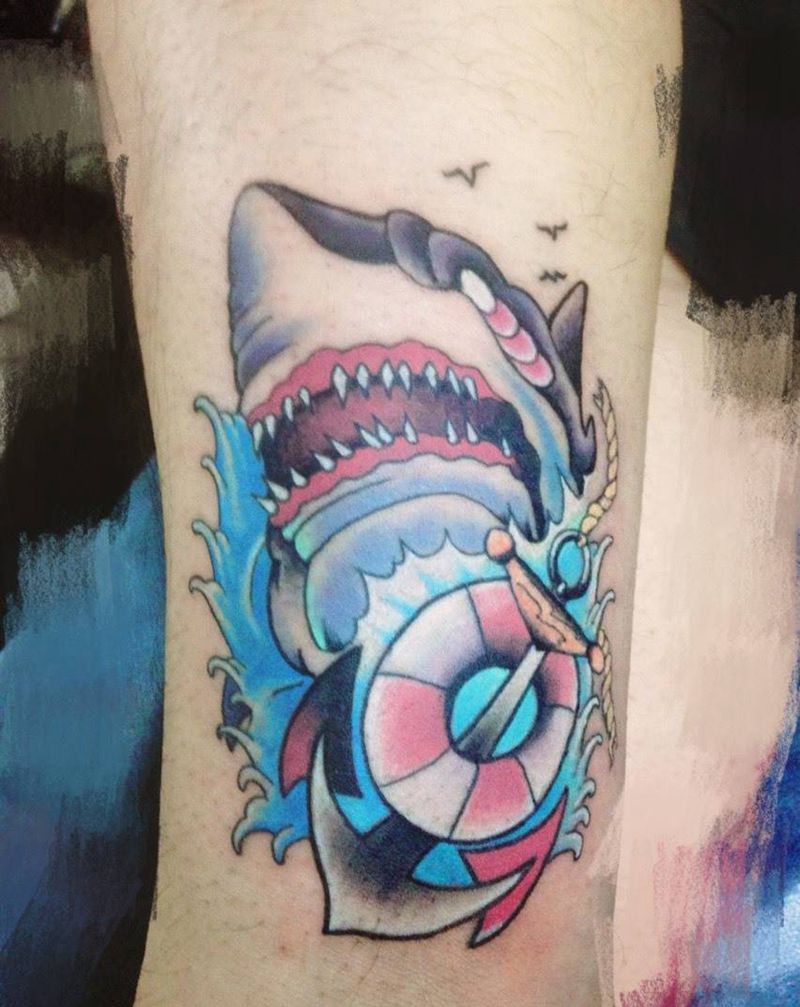当前位置: 首页 >海南省海口市纹身店-阿夺纹彩纹身图案>鲨鱼纹身图片_成品腿部欧美传统动物纹身图案
