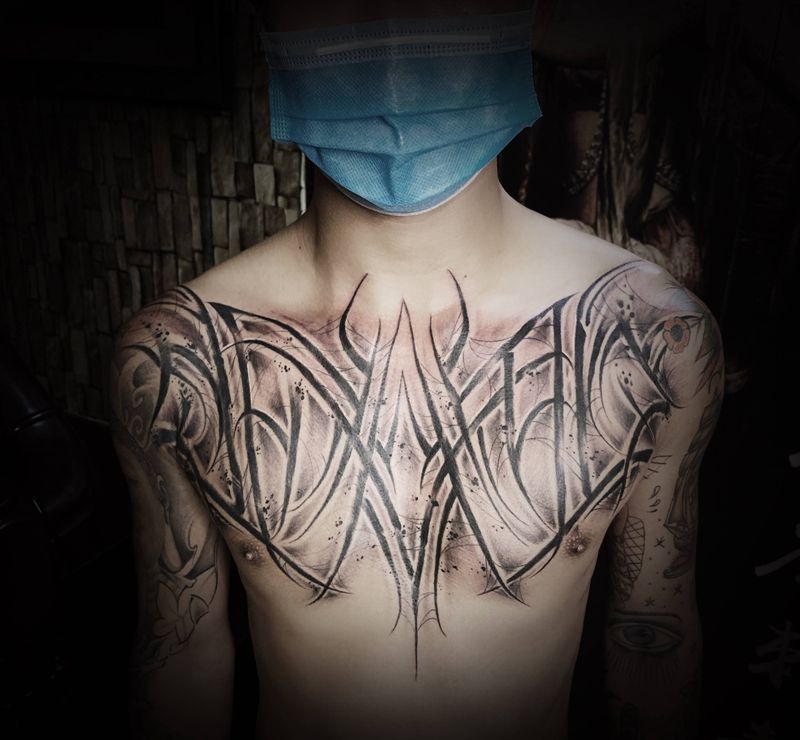 当前位置: 首页 >海南省海口市纹身店-黑木崖刺青艺术工作室纹身图案>花胸纹身图片_胸部花体字纹身图案